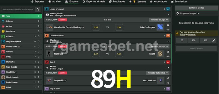 O 89H oferece uma grande seleção de opções de apostas em e-sports com probabilidades competitivas